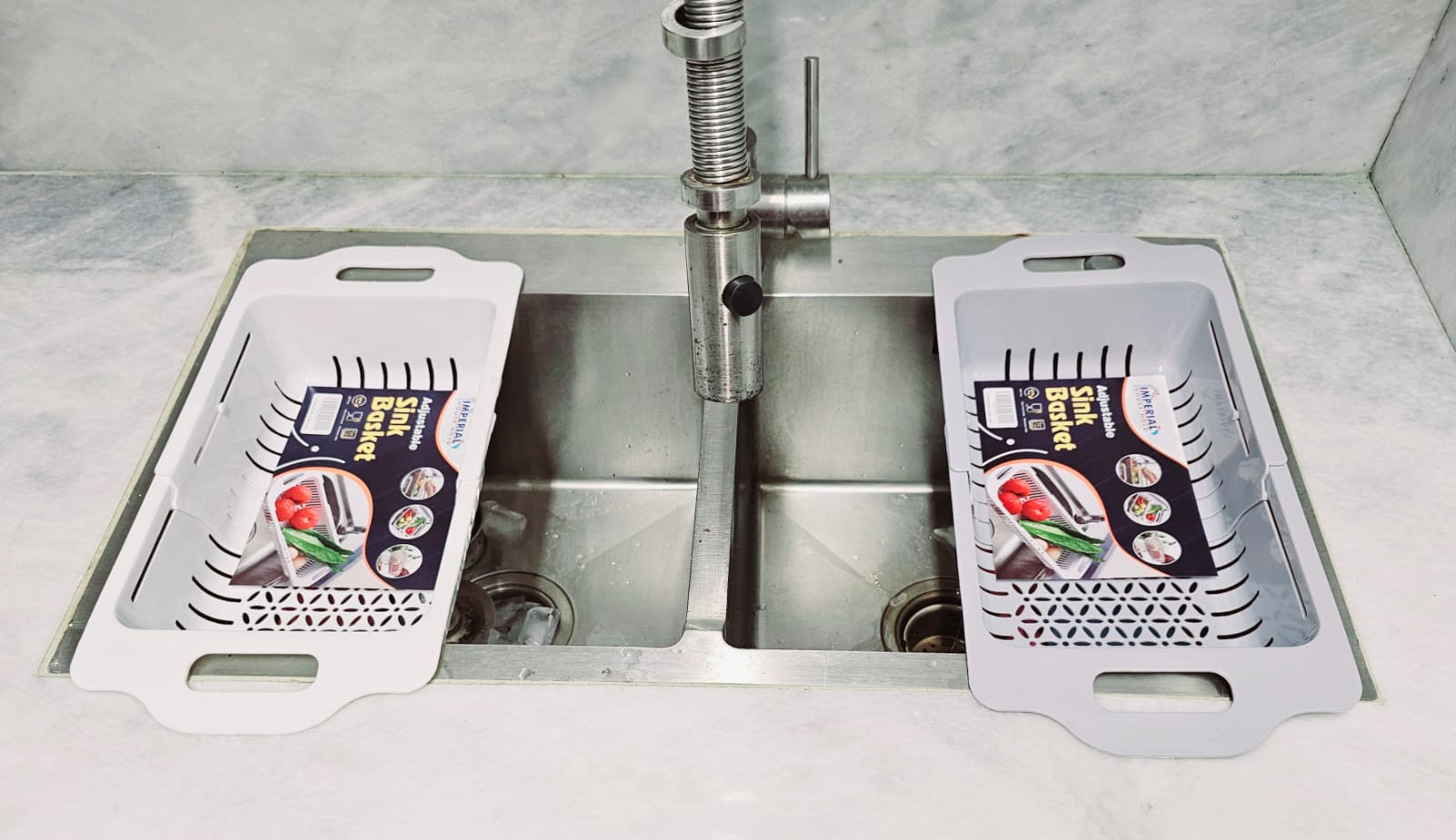 This Expandable Sink Drainer Basket is designed to fit different sink sizes with its adjustable, extendable design. The mesh structure allows water to drain efficiently, making it ideal for rinsing food, draining dishes, or drying utensils.